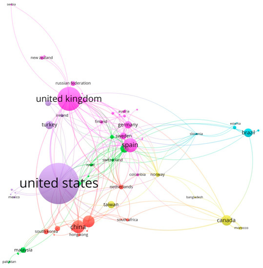 Figure 5 displays a network map between the main countries based on the co-authorship method. The countries have been grouped into 6 clusters. Cluster 1 (pink color), the most numerous, is led by the United Kingdom and it is associated with Spain, Iran, Sweden, Hungary, France, Finland, Germany, Lithuania, Argentina, Austria, Serbia, Poland, and Colombia, among others. Cluster 2 (green), led by Italy, is made up of Belgium, Cyprus, Greece, Malaysia, Israel, Iraq, Malta, Switzerland, Ukraine, Pakistan, and Saudi Arabia. Cluster 3 (red) is headed by the Netherlands and includes China, Australia, Denmark, Hong Kong, Japan, Singapore, South Africa, South Korea, Tanzania, and Viet Nam. Cluster 4 (yellow) is headed by Canada, Morocco, Kenya, Bangladesh, Qatar, Norway, Taiwan, and Thailand. The fifth cluster (purple), led by the United States, is made up of Ireland, India, Indonesia, Cameroon, Mexico, Turkey, and Zambia. The sixth cluster (cyan) is led by Slovenia and is associated with Brazil, Chile, Estonia, Latvia, Peru, and Portugal.
