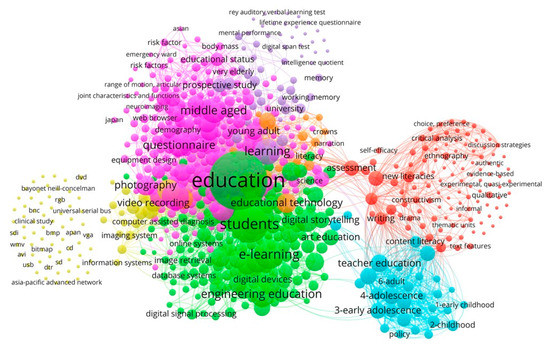 The sixth line of research, headed by the term “digital media literacies” (cyan), includes keywords such as visual literacy, methods and materials, university students, identity, teaching strategies, and sociocultural.