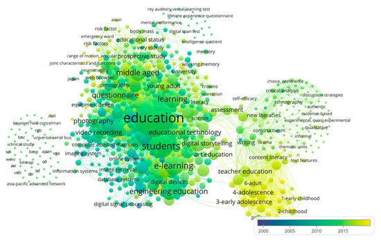 Figure 7 displays the progress of each cluster by differentiating the period in which it appeared and its evolution during the analyzed period, from 2000 to 2019. In this way, it is observed that the presence of blue clusters is reduced, which is in accordance with new technologies and the development of scientific production on this subject. It is observed that the clusters in green color and their various shades emerge from the year 2005 onwards, which allows us to observe the progress in this theme. Since 2010, green clusters have been displayed with yellow tones, which allude to the growth of scientific production in that period and to the issues related to technology, DE, and visual learning. The last keywords associated with this topic, in yellow, are related to digital and immersive technology, university education, digital art learning, deep learning or mobile learning (m-learning).