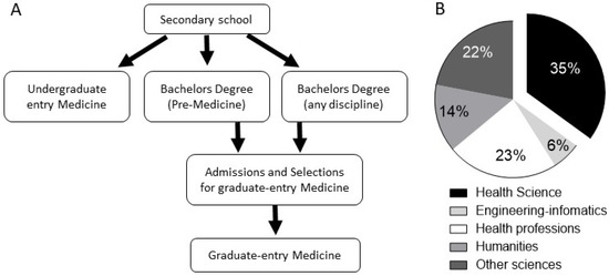 It is becoming increasingly common for medical schools to be transitioning to graduate entry medical degrees such as a Doctor of Medicine where students enter the program having completed another university degree. Graduate-entry programs are reported to increase medical student diversity, allowing more flexible and inclusive admissions policies aimed at mitigating the effect of socioeconomic disadvantage [1]. Students can enter into graduate-entry medical programs with a Bachelor degree in any discipline or from a prescribed degree often referred to as a premedical degree (Figure 1A). The majority of students entering graduate-entry medical programs are coming from undergraduate science and health science degrees [2,3,4] (Figure 1B). However, it remains to be determined if undergraduate science students approach their learning differently to those who go onto study graduate-entry medicine.