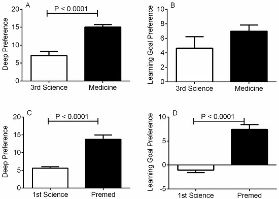 (A) Third year science students demonstrated a significantly lower preference for deep learning than those in graduate-entry medicine (p < 0.0001, t-test). (B) there were no significant differences in the learning goal preference in third year science students compared to graduate-entry medical students (C) First year science students demonstrated a significantly lower preference for deep learning than students enrolled in pre-medicine (p < 0.0001, t-test). (D) First year science students also demonstrated a significantly lower preference for a learning goal orientation than students enrolled in pre-medicine (p < 0.0001, t-test).
