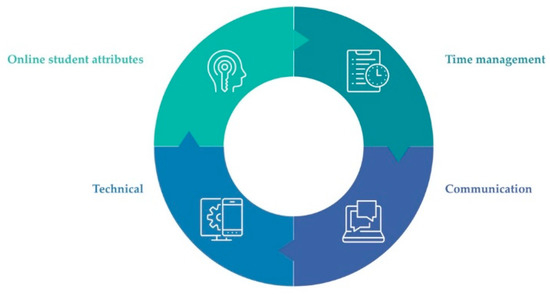 In research, student readiness for online learning has been examined through a variety of dimensions and using various measuring instruments [63,64]. This variety shows that readiness for online learning is a multi-dimensional construct, which shows a lack of consensus about its components [63]. However, researchers try to identify the most commonly used and significant dimensions in the study of readiness. Online student attitudes/attributes [63,64,65,66], time management [64,66,67], communication [63,64] and technical competencies [63,64,65,68] emerge as relevant and significant dimensions of readiness (Figure 1).
