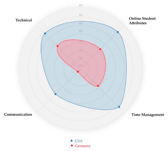 In general, one can say that the German students see the importance of online learning. However, comparing both groups of students, the German students do not see themselves as confident as the U.S. students. These differences can be explained by cross-cultural differences in the culture of teaching and learning in secondary schools but also the tradition of teaching and learning at the university level. Different education systems, academic styles, political differences and needs in the countries influence the beliefs and knowledge of the participants [90]. While in the U.S. secondary schools, students are already taking online courses, in Germany this is not the case. This is similar at the university level as well. Furthermore, the majority of the participants in Germany were taking a teacher education program, which is traditionally not online. In addition, a cross-cultural comparison has found cultural differences in U.S. and German classrooms. While American classrooms were more interactive, and American instructors used questions to enhance student-teacher interaction, German instructors relied on lectures [91,92]. This cultural practice might make the move to online teaching harder in Germany. While examining instructor readiness for online learning, it was found that German instructors rated themselves lower in terms of importance and confidence in course design, course communication, time management and technical competence in comparison with U.S. instructors [93].