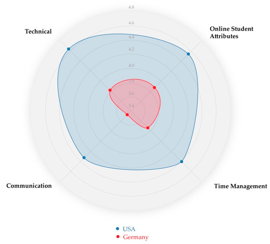 This difference between U.S. and German participants’ confidence is greater than the contrast of the students’ perception of the importance of online learning readiness competencies. It applies to all items of the survey. The most considerable difference between the German and the U.S. participants lies in the subscale of communication (MGerman = 3.47; MUS = 4.33) and technical (MGerman = 4.81; MUS = 4.63) competencies.