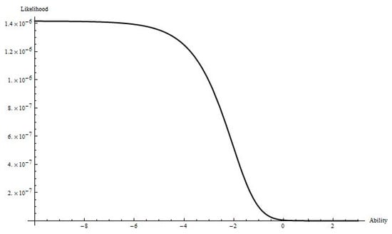 The likelihood function for Student 2 is presented in Figure 2. As demonstrated in Figure 2, a misfitting response pattern results in a likelihood function without a clear maximum and that is mainly flat for lower values of ability, and then tails down similar to the right tail shown in Figure 1. Although both students achieved the same number-correct score of five, they have different response patterns (i.e., fitting versus misfitting) and their ability estimates are different. While the estimated ability for Student 1 is approximately 0.5, there is no obvious estimate of Student 2′s ability. So, any decision-making for Student 2 based on their ability estimate is questionable, as their ability estimate may not be accurate. This example demonstrates the need for assessing fit of individual response patterns for the IRT model used.