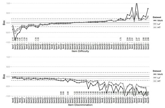 Data sets with misfitting response patterns (Misfitting) were generated by manipulating Fitting data sets for each of the three test lengths and percentage of misfitting response patterns. Rupp (2013) argued that there are many labels utilized by researchers to distinguish different types of misfitting response behaviors [12]. While most labels are attributed to possible underlying causes of misfitting responding, each label results in, generally, spuriously high or spuriously low responding. Spuriously low responses occur when a student obtains a lower score than what would be expected. Spuriously high responses occur when a student obtains a higher score than what would be expected. For generating misfitting response patterns, a method originally purposed by Drasgow (1982) was applied [29]. To generate responses leading to spuriously low responding, responses of high-ability students (i.e., students with ) were selected and their responses to the randomly selected items were changed to be incorrect with a probability of 0.8. For generating responses resulting in spuriously high responding, responses of low ability students ( were selected and their responses to the randomly selected items were set as correct. By taking this approach, misfitting response patterns differed from one student to another one. Similar method for generating misfitting response patterns was used by other researchers (e.g., [27]). For each level of percentage of misfitting responses in sample, a 50–50 percent allocation was used to generate spuriously high and spuriously low responding behavior. The 50–50 split was used because it is very rare to have only one type of misfitting response pattern in test data in real-world testing situations. The third and fourth types of data sets were, respectively, the data sets with only misfitting response patterns removed by and by HT for each condition. Hereafter, the last two data sets will be simply denoted as and HT datasets.