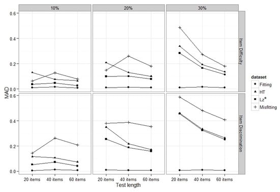 As was expected, the MADs for the Fitting dataset were very close to zero across all conditions. For the other types of datasets, however, the values of MAD tended to increase as the number of items and percentage of misfitting responses increased, particularly for the test with 20 items and 30% misfitting responses. With two exceptions (b for the test with 20 items and 10% and 20% misfitting responses), the values of MAD were greatest for the Misfitting data set, followed by the HT and data sets, which tend to be more comparable.