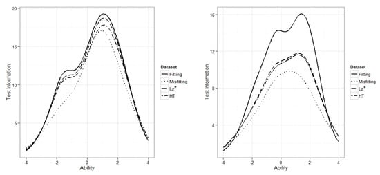 As another way of looking at the effect of misfitting response patterns at the test level, Figure 6 illustrates the test information function calculated for the same estimated item parameters used to generate Figure 3 and Figure 4 in addition to the corresponding estimated item parameters from the fitting data set.
