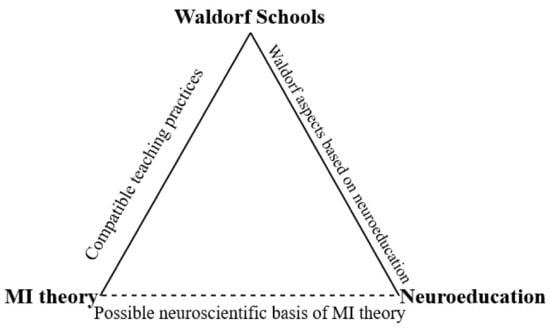 The effort to make education and neuroscience work has been likened to bridging a river too wide for crossing [34]. The effort to bridge this gap needs cooperation and effort from both sides, the neuroscience laboratory, and the classroom [11,35]. This effort and the similarities previously stated provide the basis to study the possible relations of Waldorf education, an alternative holistic pedagogical movement to the teaching applications of MI theory and to the MBE field.