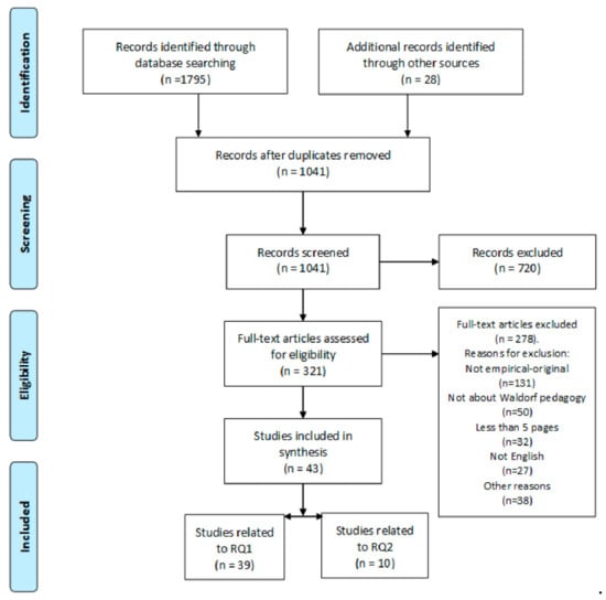 This literature review follows the guidelines described in the PRISMA statement [37], as well as those proposed by Petticrew & Roberts [38]. A list of inclusion criteria was made in order to collect the necessary articles. The intention was to find the greatest number of empirical studies about Waldorf education and, from there on, to distinguish which studies could be linked to MI theory and which to neuroscience in order to answer RQ1 and RQ2. The eligibility criteria are shown in Table 1. Appendix A contains more information about the methodology. The search included five main academic databases (ERIC, Web of Science, ScienceDirect, SpringerLink, and Scopus) websites and journals related to Waldorf education (Research on Steiner Education (Rose), The Online Waldorf Library, see Appendix A Table A2 for more). Additionally, the publications reference lists added several articles. The search terms used were chosen to return a broad selection of articles about Waldorf education (“(Rudolf AND Steiner) OR (Steiner AND Education) OR Waldorf”).