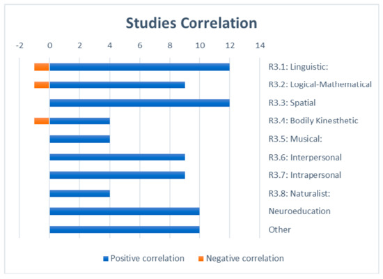 Table 4 presents each study and the intelligence codes associated to them. The studies that showed a relation of Waldorf education to Neuroeducation are also presented. There were studies that reported a negative correlation of Waldorf schools with some intelligences, which is represented with the minus symbol. Two of the studies, although relevant to the research questions, were neutral and were not given any code.
