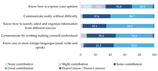 The contribution to the increase in the levels of literacy (Figure 2) of the operational assistants was notoriously essential in the domains that are considered indispensable for the performance of their functions. These domains include the sphere of information and communication (through the development of the analysis capacity), the sphere of understanding, production and content transmission in the different contexts of action that are included. This last domain is reflected, for instance, in situations of communication with foreign students and their families, escorting the users of the educational institution or even to know how to express their opinion (64.2% indicated that this was of some to great contribution) and communicating both orally and by writing (58.7% and 50.5%, respectively, stated that this was great contribution).