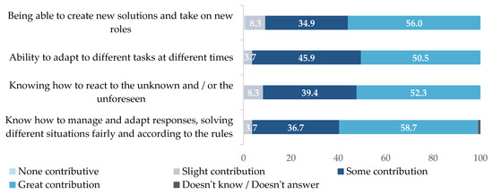 The acquisition and/or reinforcement of technical-professional knowledge, such as the application of basic life support techniques and the assistance to students with special health needs, the awareness for the rights and duties of all users of the school—knowledge indispensable for carrying out the operational assistants’ day-to-day job—are identified by them as new and important acquired skills. It should be noted that 58.7% of the surveyed operational assistants referred that the training-capacity actions contributed significantly to the management and adaptation to the responses they are faced with daily, resolving different situations fairly and in accordance with the norms (Figure 3).