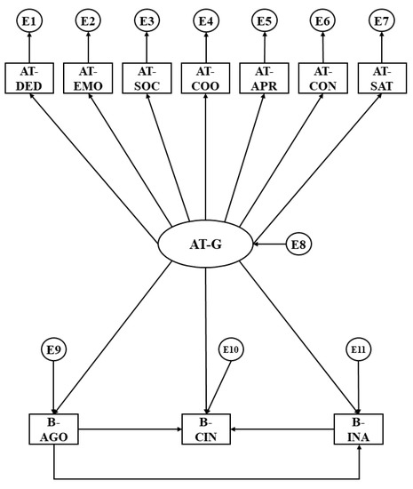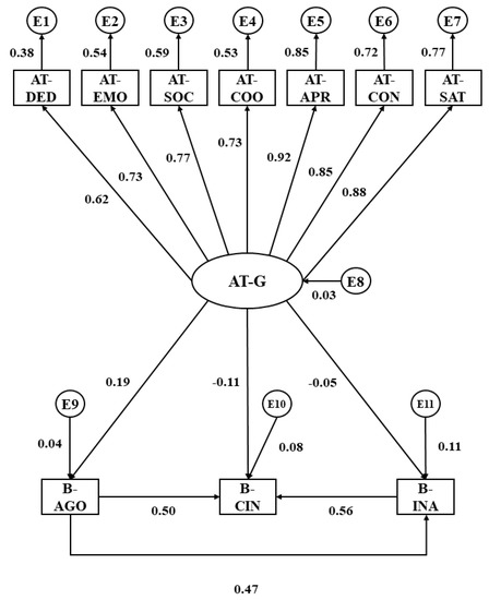 Figure 1 shows the path model constructed. In the first instance, the endogenous variables in the model were determined, with which error terms were associated. One of the primary variables was Overall Tutorial Action (AT-G), which is an endogenous variable, and it comprises a number of different indicators. Amongst these indicators, which are observable and exogenous variables, we found dedication to tutoring of one hour a week (AT-DED), working on emotions in tutoring (AT-EMO), working on socialisation (AT-SOC), working on cooperation with classmates (AT-COO), the approach to learning challenges (AT-APR), the consideration of co-existence challenges (AT-CON) and students’ satisfaction levels with the tutors (AT-SAT). On the other hand, variables linked to burnout acted as exogenous variables within the model. Amongst these variables, we found burnout-associated exhaustion (B-AGO), burnout-associated cynicism (B-CIN) and burnout-associated inadequacy (B-INA).