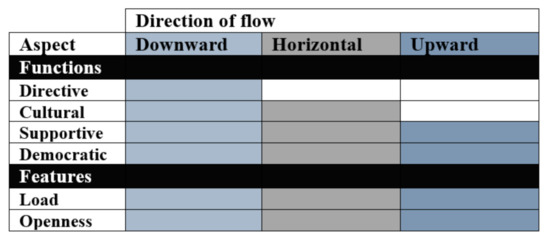 In addition to the mechanics of the communication process and its features, it is also important to recognise functions of messages in organisations. Classical organisation theory posits that interactions may relate to execution of tasks, innovation or change, and maintaining relationships. Task messages flow normally downward from leadership echelons to staff in the form of directions or rules. Messages about change or innovation may also be downward, whilst messages aimed at maintaining relationships may generally be in the form of affirmation from leaders or managers to staff members [24,26]. Horizontal communication is not strongly emphasised, except to solve work-related problems that referral upward and waiting for downward responses would limit [28].