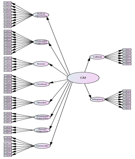 In addition to these adjustments, a number of cross-loadings were identified. For example, CM66, concerning too many messages from colleagues and part of overload, appeared also to contribute to horizontal supportive (loading = −0.19). The association made sense, however, as one could easily conceive too much information from other staff being a by-product of horizontal communication but also contributing to perceived load. The negative association, of course, indicates that this scenario is an unpleasant aspect of communication that may erode feelings of support. In a similar vein, the link between CM58, concerning the reliability of information coming from colleagues, and overload (loading = −0.17) alludes to the possibility of such information contributing to perceptions of communication overload. A cross-loading, between CM57 (downward supportive) and cultural was also explainable (loading = 0.10). The item refers to times when principals get behind staff who are lacking confidence, which could extend to school culture, either because such behaviour is part of the culture or the thing they are not confident in has to do with school policy. Another cross-loading (0.35), between CM05 (adequacy, concerning information passed on by colleagues) and cultural (loading = 0.35) is understandable because the information staff members pass on to colleagues may relate to cultural matters.