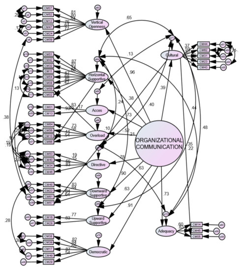 More than twenty error correlations and twelve cross-loadings were added to the model incrementally. While adding the specifications detailed above improved fit somewhat, with SRMR and RMSEA indices well below 0.05, the GFI, AGFI, TLI, and CFI readings were below the suggested cut-offs of 0.90 and 0.95. Attention was then turned to the loadings of items as recommended by Byrne [74]. Inspection of items that shared error correlations and cross-loadings revealed several to have the lowest loadings on their factors and reference back to the results of EFA revealed that these items had small to moderate cross-loadings (between 0.20 and 0.30) on more than one factor. These issues have been identified as bases for item removal in previous research [80]. Removal of 19 items, starting with those that had lowest loadings in Model 2, led to dramatic improvement in model fit, and eventually to the final Model 3 (see Table 6). The removals also resulted in less error correlations and only four cross-loadings (those described earlier). The loadings of the ten factors on to organisational communication were influenced by these modifications to varying degrees as, shown in Table 5, but these variations were of no great concern. The final model (Model 3) including estimates is presented in Figure 4. For greater clarity, Table 7 lists the standardised regression weights of each item to their factors in Figure 4. Table 8 presents the standardised regression weights of the cross-loaded items shown in the model, and Table 9 lists the error correlations in the model.