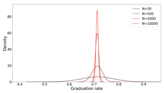 The sampled probability distribution functions (pdfs) of the estimated graduation rates when using the AMC method are shown in Figure 3 for a variety of cohorts with different sample sizes. As the figure illustrates and Table 3 reports, the sample standard deviation of the estimated graduation rate for cohorts with small sample sizes is high (e.g., for , the sample standard deviation is ). Besides the poor performance of the AMC in terms of limiting the sample standard deviation, the AMC introduces a bias from the true graduation rate, as established by the actual six-year graduation rate. The estimated graduation rate based on the AMC method is 68.6% (the bold number in Equation (6)), while the true six-year graduation rate for the same cohorts on which the original was based is 71.20%; the same bias is present for all sample sizes. In other words, the AMC model underestimates the six-year graduation rate.