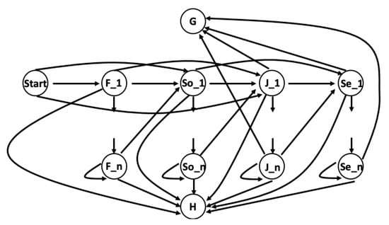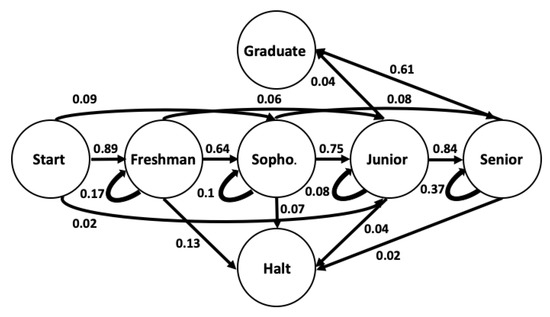 Different approaches are used to evaluate students’ performance and persistence in higher education systems, among which machine learning algorithms and stochastic models are the most common [11,12,13,14,15,16,17]. Markov models have been used in many educational studies to analyze students’ academic progress and behaviors [3,18,19,20,21,22]. For example, Nicholls [3] analyzed the progress of graduate students through a degree program in Australia. Using Markov modeling techniques, the authors assessed students’ performance according to measures like expected time to graduation and graduation rate. The authors developed a Markov model that includes two absorbing states representing withdrawing from the program and graduating. Additional transient states represent the students’ status at the end of each year based on their academic performance. A similar modeling procedure is provided by Bairagi and Kakaty [23], who focused on a university system in northern India. While maintaining a significantly different academic structure (e.g., number of courses per semester, semester exams for each course), their Markov models were also able to track and model student progression.