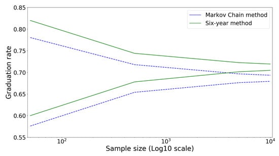 Another common approach for estimating graduation rates is to build a Markov chain based on historical data [3]. One advantage of this method over the standard SYGR is that the Markov chain method can be adapted to capture and represent student progress at a university throughout the same six-year period. In other words, the method models some temporal aspects of student progress, which SYGR does not model. However, as we will show in this paper, the accuracy of estimating graduation rates using Markov chains is quite sensitive to data availability. This disadvantage makes Markov chains unreliable in the context of educational assessments, especially when the sample size of the data used to generate the Markov chains is small. Additionally, as part of this paper, we will demonstrate that graduation rates estimated using Markov chains have the potential to be biased, often underestimating the true graduation rate. As such, the driving concern underlying this paper is how small universities should accurately estimate their graduation rates, or even in the case of larger universities, how they go about estimating their graduation rates for degree programs with lower enrollments (e.g., physics, mathematics) or for cohorts with low representation, e.g., women in specific science, technology, engineering, and mathematics (STEM) degree programs [4].