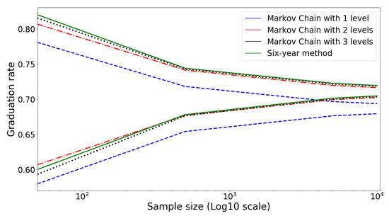 The results for estimating the graduation rate using SYGR, AMC, and the multi-level absorbing Markov chain with n = 2 and are shown in Figure 6. As depicted empirically in the figure, the estimation bias for the Markov chain method with and levels becomes negligible compared to the Markov chain with the level, which corresponds to the standard AMC. While the estimation bias is virtually removed through the addition of multiple levels, the sample standard deviation of the graduation rate estimates still remains high, especially for small n, as represented by the size of the 5–95% inter-quartile interval. In the next section, we address this shortcoming when applying Markov chains.