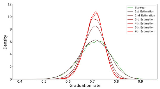 The probability density function (using Gaussian kernel smoothing with = 1) for estimations using the six-year graduation rate (SYGR) method.