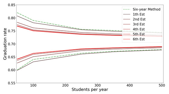 The standard six-year graduation rate method corresponds to estimating the graduation rate by maximizing the likelihood function in Equation (2). Based on the maximum likelihood estimation (MLE), the estimated graduation rate follows the frequentist approach [10], whereby is an unbiased estimator for graduation rate.