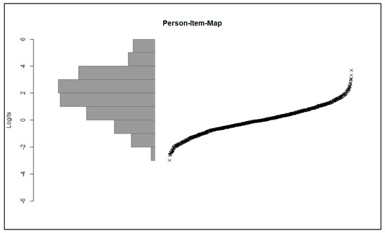 Due to the use of the Rasch model, it was also possible to map the item and person parameters on the same scale. The personal parameters WLE (Weighted-Maximum-Likelihood-Method) [62] were determined by a pairwise item comparison [63,64]. This method is particularly suitable for data sets with missing values [64,65]. The WLE can be used to assess the appropriateness of the degree of difficulty of the items. The person item map (see Figure 1) shows the person parameters as histograms, as well as the item difficulty. It becomes clear that the measurement range of the items essentially corresponds to the distribution of the person parameters. However, one can see that there is a lack of items for students with particularly high skills.