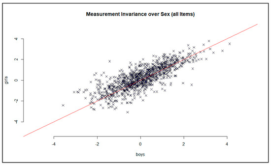 In order to check for differences in item difficulties between boys and girls (test fairness regarding gender), a graphical model test was carried out to assess the measurement invariance of the items.