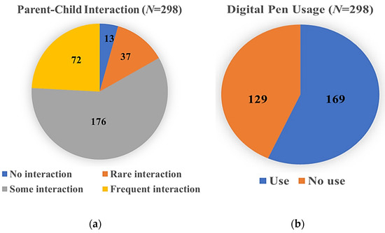 A descriptive statistic was performed to examine parent-child interaction frequency and digital pen use during English picture book reading. Of the 298 participants, 13 (4.4%) parents did not interact at all, 37 (12.4%) parents rarely interacted, 176 (59.1%) parents sometimes interacted, and 72 (24.2%) parents frequently interacted (Figure 1). For digital pen use, 169 (56.7%) children used digital pens and 129 (43.3%) children did not use digital pens during English picture book reading.