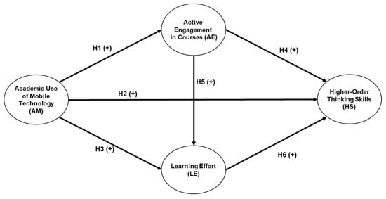 Students’ active engagement in learning includes psychological and behavioral engagement through constructivist methods of learning [55,56,57,58,59], such as efforts made for study, higher-order thinking skills, and participation in educationally effective practices. Higher-order thinking skills are not enhanced automatically; instead, students need to be engaged in educational activities for these skills to improve [60]. Engagement indicates the extent to which students are actively involved in educational activities that are likely to lead to high-quality learning [40]. For students to develop higher-order cognitive processes through engagement in course activities, they need to be highly participative and make substantial effort in learning [61]. We consider active engagement in courses (AE) useful in the relationship between the use of technology and higher-order thinking skills. Therefore, we hypothesize the following: