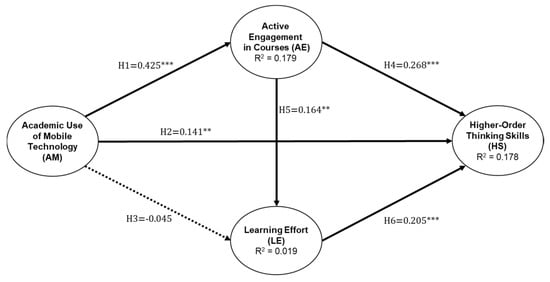 This study focuses on the influence of undergraduate students’ academic use of mobile technology on their higher-order thinking skills through their active engagement and learning effort. Since students are increasingly using mobile technology for academic purposes, there is a need to understand the educational impact of this technology on students’ university learning experiences. This study predicted that students’ academic use of mobile technology in courses would be beneficial for their engagement and perceived higher-order thinking skills. The results of the PLS-SEM analysis support five of the six proposed hypotheses: H1, H2, H4, H5, and H6. Our findings reveal that the use of mobile technology for academic work supports the propositions of our research model regarding the mediation of students’ active engagement in courses and learning effort. That is, students’ academic use of mobile technology positively affects their perception of their higher-order thinking skills. Based on the empirical results, several key findings emerge.