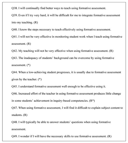 Self-efficacy is a capacity belief that can be an indicator of a teacher’s confidence that they can successfully perform specific teaching acts. Bandura [9] wrote that self-efficacy beliefs ‘…contribute significantly to human motivation and attainments’. These values were relevant to this study, since we were interested in facilitating teacher use of various forms of formative assessment during their science teaching. Both teachers’ motivation to use formative assessment and their ability to do so were related to their relevant self-efficacies. We measured variables which contribute to self-efficacies before and after several years of iterative uses in order to assess changes that would indicate differences in their judgement about their capacity to use formative assessment in teaching.