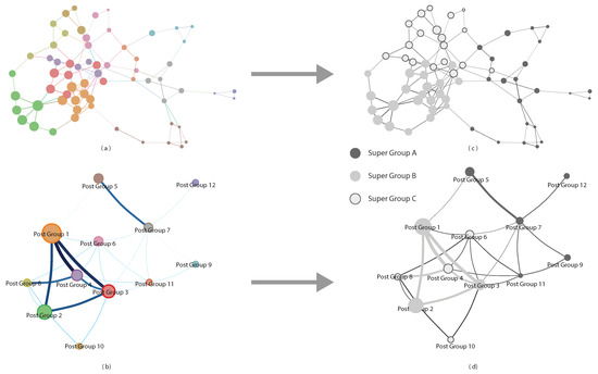 Based on a visual inspection of the network and network map as depicted in Figure 3a,b, we initially merged Post Groups 1–12 into Super Groups A, B, and C. Super Group A consisted of Post Groups 5, 7, 9, and 12, Super Group B of Post Groups 1–4, and Super Group C of Post Groups, 6, 8, 10, and 11. This initial grouping was made by investigating shared links in the network map (Figure 3c) and spatial placement in the layout of the network (Figure 3a). Since it was done by visual inspection, we made slight permutations of Super Groups to see if they would result in a better-quality solution. We used the Modularity, Q, as our measure of quality. Thus, we searched for the solution with three Super Groups that would maximise modularity. However, we also wanted to embed the Post Groups found empirically and robustly by Infomap in Super Groups. As such, our first rule for changing Super Groups was that whole Post Groups could switch between Super Groups. Our second rule was that Post Groups could only switch to a Super Group to which they were adjacent in the network map. The third rule, our decision rule, was that if a switch increased Q, the new solution was accepted, if not, it was rejected. If a new solution was accepted, the adjacency of all Post Groups to Super Groups were re-evaluated. The end result was Super Group A consisting of Post Groups 5, 7, 9, 11, and 12 (22 teachers); Super Group B consisting of Post Groups 1, 2, and 3 (23 teachers); and Super Group C consisting of Post Groups 4, 6, 8, and 10 (19 teachers). Figure 3c,d show Super Groups A, B, and C. The modularity of the new grouping was Q = 0.515 , which is lower than the optimal solution but still indicative of a strong group structure [41]. The analyses of similarities yielded an average of internal similarities of 0.51 ( S D = 0.09 ), which was significantly higher ( t ( 85.59 ) = 3.895 ,   p < 0.0005 , Δ = 0.99 , 95% CI = [0.56, 1.43]) than the average external similarities of 0.45 ( S D = 0.05 ).
