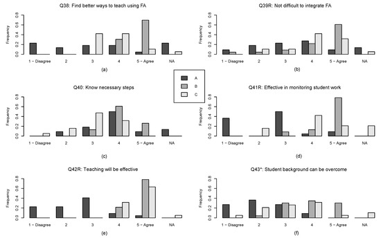 While such an agreement is not found on question Q49R on having the have the necessary skills to provide formative assessment. Again, a Kruskal-Wallis test revealed significant differences ( χ 2 ( 2 ) = 28.4 ,   p < 10 6 ). Here, there are significant differences between Super Group A and B ( χ 2 = 28.3 ,   p < 10 6 ), between A and C ( χ 2 = 7.36 ,   p < 0.05 ), and marginally between B and C ( χ 2 = 5.47 ,   p < 0.1 ). The Supplemental material provides detailed calculations for all question frequency distributions. 63% of Super Group A were coded with a 2 on Q49R, giving them the lowest entropy of the three groups on that question. The agreement of Super Group A on Q49R contrasts their answers to questions that may be seen to pertain to different formative assessment skills. The group is diverse on whether they perceive it as difficult to integrate formative assessment (Q39R), whether they will be effective in monitoring student work (Q41R, almost dichotomous between 1 and 3), whether their teaching with formative assessment will be effective (Q42R and Q45), and whether they will be able to explain content (Q47R) or able to answer student questions (Q48) using formative assessment. Thus, although the problem for this group seems to be that they do not believe that they have the necessary skills, it is different skills they miss. Super Group A shows somewhat less diversity with regards to outcome expectations. They generally do not seem to believe that the inadequacy of student background can be overcome by using formative assessment, but seem to agree that if a low-achieving student should progress, it will be because of the teachers’ use of formative assessment (Q44).