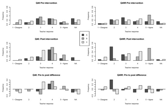 In Figure 6, we notice apparent shifts towards more consensus for Super Groups on Q40 (know necessary steps). Super Group A’s responses seem shifted towards option 4 (indicated by the positive value), as are Super Group B’s. Super Group C’s responses seem shifted towards option 3. To quantify these apparent shifts, we compared them with all 216 shifts ( M = 0 , S D = 0.13 , see Supporting File for details) by calculating the Z-score, Z = ( x M ) / S D . Compared to all shift-values, the shift in option ‘4’ on Q40 for Super Group A was marginally significant ( Z = 1.73 ,   p < 0.1 ), for Super Group B on option ‘4’, the shift was significant ( Z = 2.64 ,   p < 0.01 ), for Super Group C on option ‘3’ the shift was also significant ( Z = 2.40 ,   p < 0.05 ). Furthermore, the negative shift for Super Group B on option ‘3’ was marginally significant ( Z = 1.65 ,   p < 0.1 ). No other shifts in the distribution were significant. Thus, we can say that a positive shift occurred for each Super Group towards either a medium or a medium high level of agreement with Q40s statement, but we cannot claim that this resulted from any one negative shift on other options. Rather it seems that each Super Group’s distribution narrowed towards medium or medium high levels of agreement with knowing the necessary steps to teach effectively using formative assessment. For Q49, only one shift was significant; Super Group A had a significantly positive shift on option ‘2’ ( Z = 3.11 ,   p < 0.005 ). No other shifts were significant for this question. Thus, while Super Group B and C did not change their position on Q49, Super Group A shifted towards not being certain of having the necessary skills to use formative assessment. We have included pre intervention to post intervention graphs for all questions in the Supplemental Material.