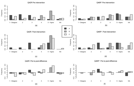 As a different illustrative example, we compared Super Group shifts on Questions Q42 and Q46. Figure 7 shows that Super Group B and C shifted their selection towards agreeing with the the self-efficacy attribute statement that their teaching would be very effective using formative assessment. The shifts towards option ‘5’ were significant for Super Group B ( Z = 1.98 ,   p < 0.05 ), and for Super Group C ( Z = 2.80 ,   p < 0.01 ). Super Group C has some uncertainty as to whether an increased effort in using formative assessment will produce change in some students’ achievement (options ‘2’ and ’NA’ are prevalent in Figure 7f). Super Group B, on the other hand, seems to be more certain that increased effort in using formative assessment may produce change in student achievement. This may be a subtle signifier that the intervention supported both groups in their beliefs that they are able to use formative assessment, but did not convince teachers in Super Group C that this would be beneficial to all students. Super Group B may have gone into the project with the belief that formative assessment would be beneficial to students and did not change that belief.