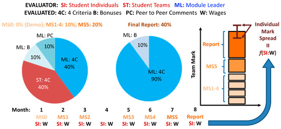 Team performance in all MSs was mapped against 4 criteria that were pre-emptively defined and communicated to students. All teams (and the lecturer) completed an evaluation form based on the same four criteria. As summarized in Figure 1, the average performance from peer group evaluation accounted for 40% of the final MS mark, with another 40% being determined by the lecturer. An additional 10% was attributed by the lecturer for the group performance on MS specific topics, such as Computer Aided Design and product datasheet specification, which had been informed by short tutorials/training sessions prior to the MS. The students were additionally encouraged to complete a peer-assessment exercise which was moderated through the Virtual Learning Environment (VLE) supported across Bangor University [14]. The peer-assessment exercise required all teams to express constructive comments on each other’s MS work, and determined the residual 10% of the mark basing on the (lecturer perceived) quality of the comments. MS 1–4 were given a 10% relative weight in the final evaluation. The Final Milestone (MS5) was given a 20% weight; the Final Report was given a 40% weight and was solely evaluated by the lecturer.