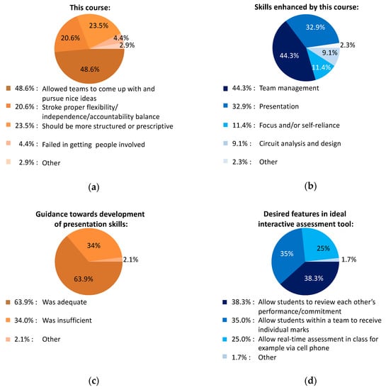 The question in Figure 2b sought to determine which skills were enhanced by the followed approach according to learners. A total of 44% of the answers indicated management and teamwork as the most enhanced skill, which is an expected and desirable outcome. A considerable fraction of students acknowledged improvement of presentation skills, which is also among the primary learning outcomes. The recognition for improvement of circuit design/analysis skills was less prominent (9%) and to some extent, disappointing. One student commented that “(students) did not really expand their understanding of more intricate system beside the hobbistic knowledge of systems such as Arduino microcontrollers”. Although it is true that training on new design techniques and circuit analysis was not a primary goal nor systematically pursued, the number of learners acquiring new technical skills through the followed hands-on approach might be somehow higher. Most teams faced and regularly reported circuit synthesis and software programming issues that they had never encountered before. The fact that most issues were successfully solved during the course could be taken as a measure of success of the followed approach, even in the absence of more structured training. It could also be argued that full appreciation of the skills acquired during the second-year team project module could be only achieved during the third-year individual project module.
