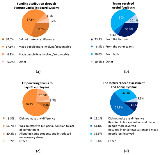 The question in Figure 3a probed the impact of the first major novelty introduced in this action-based project: the introduction of a VCB system to allocate the School project funding. It can be seen that while more than 57% of the students recognized the system’s merit in promoting involvement and accountability, about 6% of them took the opposite view. The key to interpret such discontent is offered by the answer to following question and by the 6% of students—not necessarily the same as the complaining 6%—who provided additional feedback in the open section of the question. The most critical students stated that the fundamental flaw in the VCB system is that some teams “were biased against other teams” and that “it is an overall good idea, as it requires more interaction, but unfortunately ruins other people’s grades, without giving a valid reason”. The latter is particularly interesting as it seems to overlap the funding attribution and the marking systems, in spite of the lecturer’s intent. It is arguable that a team with scarce funding attraction potential ends up performing poorly on the technical side and therefore earning low grades. However, in terms of sheer funding availability, the difference between the most and the least successful teams turned out to be below 20% and was lower than the team grades spread.