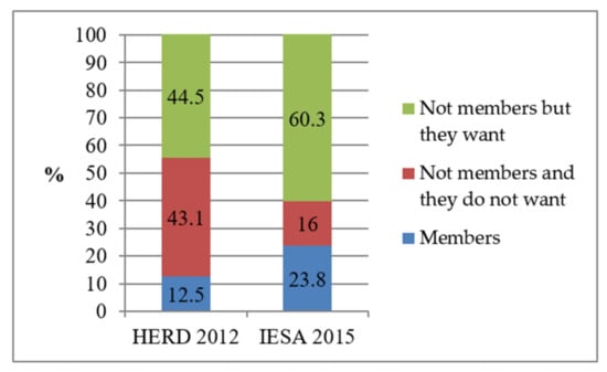 Figure 2 depicts the participation of students’ membership in charity groups or organizations in 2012 and 2015, presented as a percentage. We can observe that, in three years, the engagement of students was nearly doubled, and it is important to highlight the big score of students (nearly half of them in 2012 and more than half in 2015) who were not members of charity organizations, but they were willing to become members.