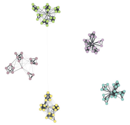 Figure 7, the group first breaks into a group of four students (61, 128, 79, 116) and the rest of the class. We can thus interpret that this group of four is only weakly connected to the whole group, as all links connecting it to the rest have low weights. However, the students in this group of four are strongly connected to each other.