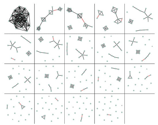 Figure 6) all links, meaning all contacts between individuals, are present). As the weakest links are removed, progressively, subgroups appear. When stronger and stronger links are removed, the number of subgroups increases, but progressively groups are broken up to individuals as the percolation steps reach a point which removes the strong links inside the groups.