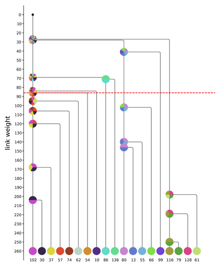 Such tree gives many possible partitions of the original network, depending on where we cut in terms of limit weight. In our case, we however have a potential natural threshold by using the TA as a reference. At some point in the depercolation process, the TA becomes isolated in the network. By definition, the TA does not belong to any student group. We can thus consider that links weaker than the strongest link connecting the TA to the network are not relevant. In the tree, this is noted as the red dashed line. All groups that break before this point (i.e., above the red line in