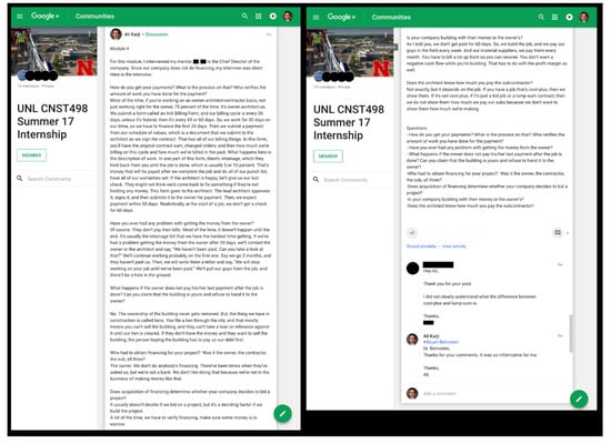 Each week, students were assigned reading materials for each module. The content of each module was usually two to three articles. After reading the materials, students were supposed to come up with some questions about the material related to the module. They were supposed to interview their mentor or an individual in the company who was associated with the content of the module. For example, for module 3, which is Business Development and Marketing Strategies, if their mentor did not have enough expertise in the marketing area, students could interview a person in the marketing and business development department. The purpose of the modules was to boost the students’ skillset through studying important skills and topics such as Communication, Leadership, Time Management, Risk Analysis, etc. By interviewing different employees in the company, various concepts and skills could be retained more efficiently by the students simply from listening to employees who had daily, practical experience with the related issues. For the ten designed modules, the students were required to carry out ten interviews over ten consecutive weeks. At the end of each week, students were supposed to share their interviews with other students. It is shown that when students share what they have learned and the key takeaways from their internship experience with other interns, it creates an environment where all the students learn from each other’s point of view [46]. Therefore, the instructor of the class made a private Google + Community, which the students were members of, and they could create a blog post to share their interviews with other students (Figure 1). All the students were able to see each other’s weekly blog posts and learn from different students’ interview questions and responses. In addition, students were supposed to comment on each other’s blog posts and reply to the comments. Figure 1 shows an example of a blog post.