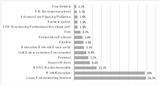 Participants most commonly mentioned general knowledge and learning about death and dying as both their motivation to join the MOOC as well as a learning goal. This suggests that there is genuine interest in engaging with issues around palliative care, death, and dying by both health care workers and non-health care workers, as well as ability to perform better at work. Some 40% of the participants reported having done a MOOC before, suggesting that they had pleasant learning experience through the platform. The Dying2Learn MOOC was first conducted in 2016 and it was also received positively with high satisfaction scores [9]. This result suggests that participants are open to learning on MOOCs and they are a feasible and useful learning vehicle. Indeed, there were participants who mentioned the nature of course delivery as a motivation to enrol in the course. MOOCs are not only free to access, but they also cater to busy schedules of participants as they allow them to complete the course flexibly in their own time.