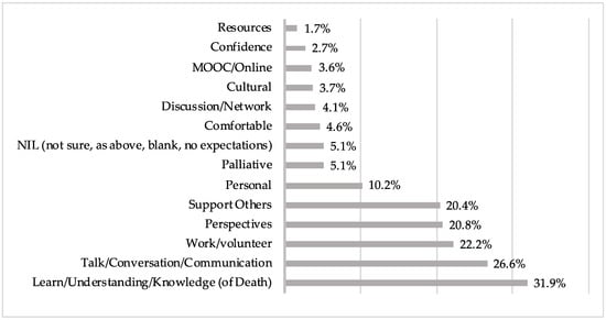 | Support Others | To be able to apply what they have learnt in the course to support people who are going through or experiencing death, helping them to cope with death | “I hope that, with a better understanding of death and dying, I would be better able to journey with these people-to ally their fears, help them to accept their situations, bring some positives to their final days.” “To improve my knowledge and understanding and to be able to support people at this time in life, to be able to initiate open discussion around death and dying and to reduce any fear, stress or anxiety.” | 160 | 20.4 |