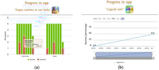 Graphics of the feedback for each game on the Smile and Learn platform: (a) Feedback graphics of the right and wrong answers each time played; (b) feedback of the progress from several play sessions and levels played.