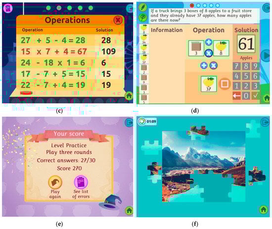 Screenshots of feedback examples at the activities: (a) Initial self-assessment questions for the experiment activity in the science world; (b) screen of the level progress in the adaptative calculation; on the top of the screenshot, the right and wrong answers can be assessed; (c) assessment of right and wrong answers in adaptative calculations; (d) feedback corrections to promote self-assessment; (e) final score screen for practice multiplication; (f) timed feedback for the spatial world in the puzzle activity.