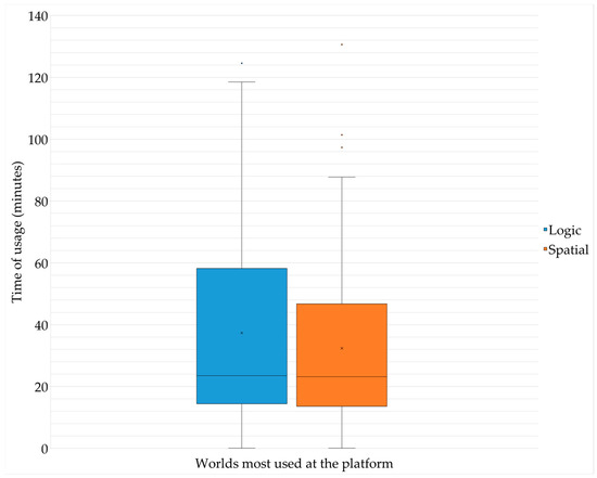 Greater use was made of the applications related to logic and visuospatial aspects given unrestricted use at school. This study selected the worlds whose activities exceeded 50% usage. Thus, we focus on the Logic and Spatial worlds. The descriptive statistics of usage for the Logic and Spatial worlds are presented in Figure 3.